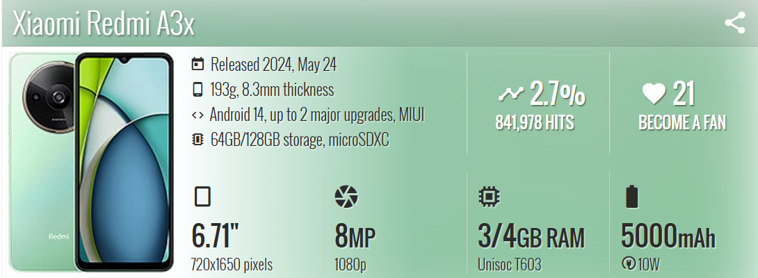| Chipset | Unisoc T603 (22 nm) | |